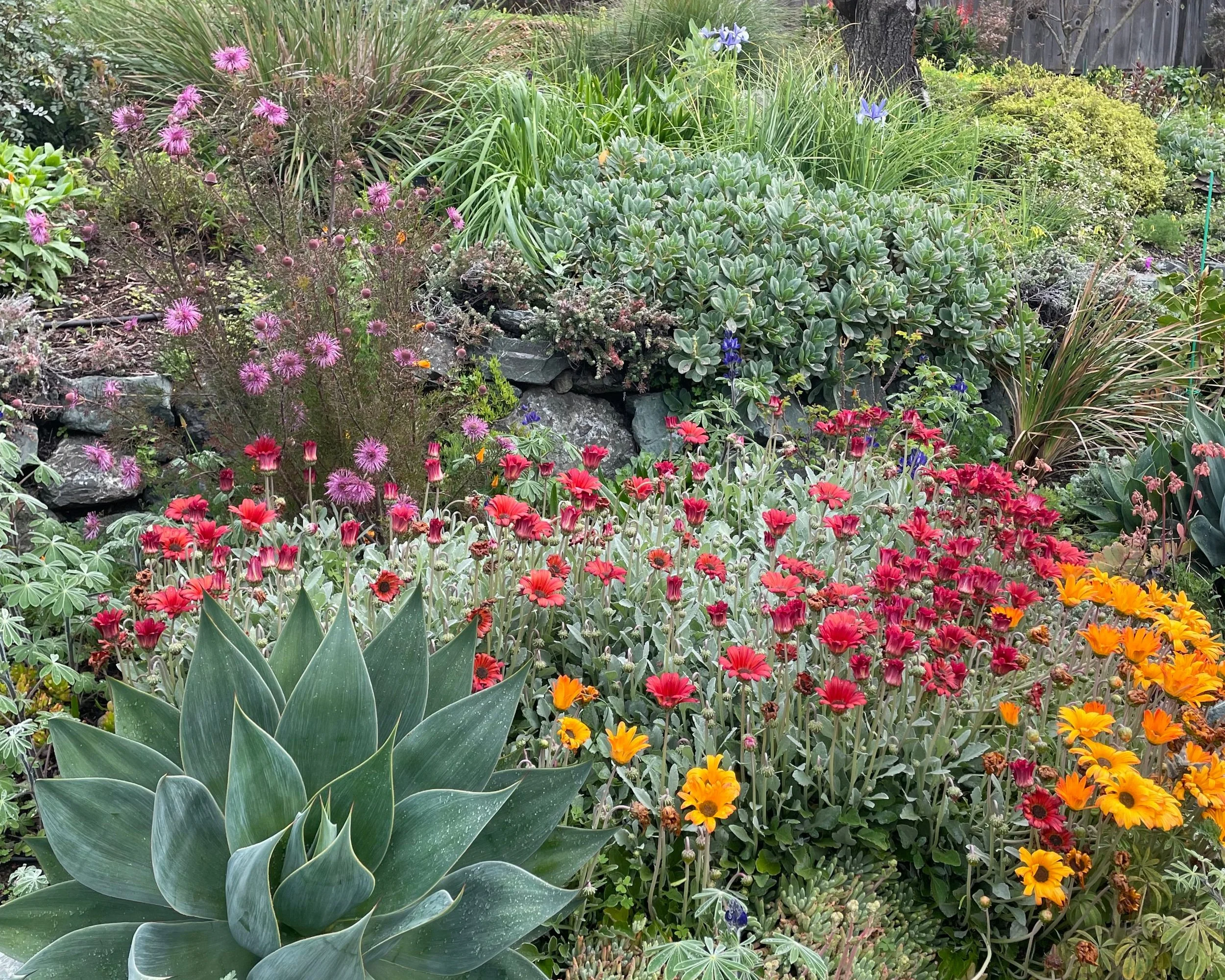 The ask was bold and slightly dissonant. Australian and South African plants, lots of color, lots of texture, and yes… roses. I’m someone who likes to build plant communities that speak the same language. The rose felt like an unexpected guest at a dinner party. Still, we worked it in for better or worse.